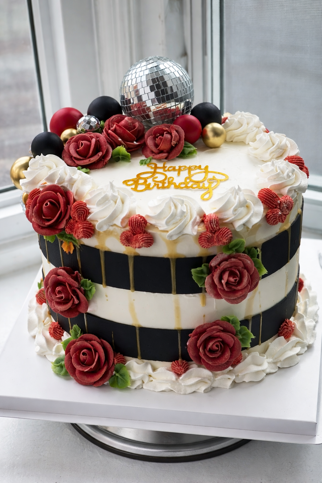 A sophisticated celebration cake featuring smooth buttercream with bold black bands, a rich gold drip, and handcrafted burgundy roses. Finished with luxe gold accents and a statement topper, this design is perfect for elegant, modern celebrations.