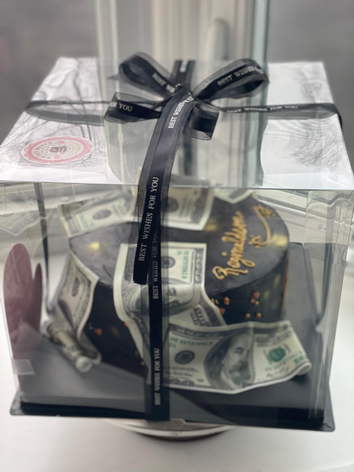 Indulge in luxury with our rich black buttercream  cake, elegantly adorned with edible $100 sugar sheets and shimmering gold accents. A bold, opulent statement perfect for celebrating success, milestones, or anyone who’s living life in style.